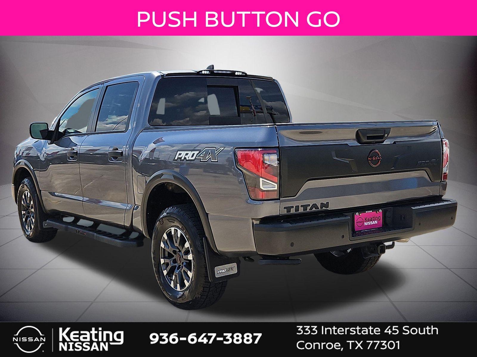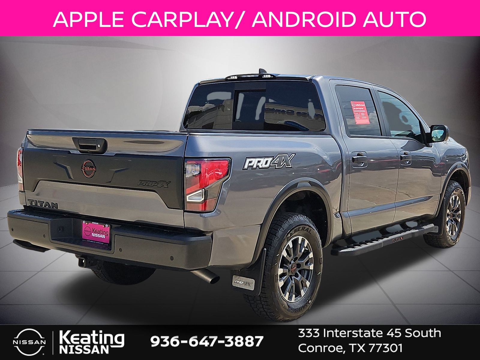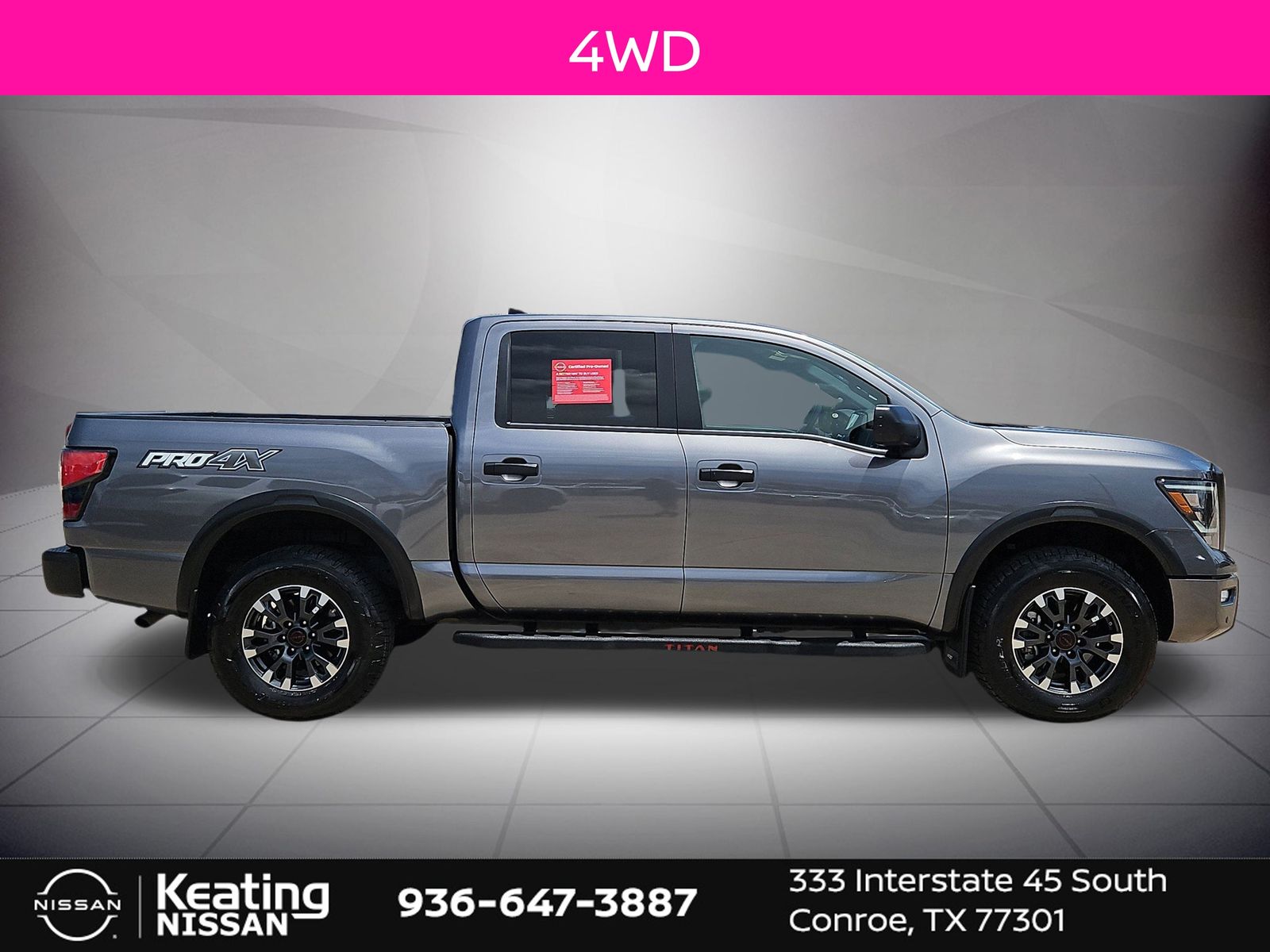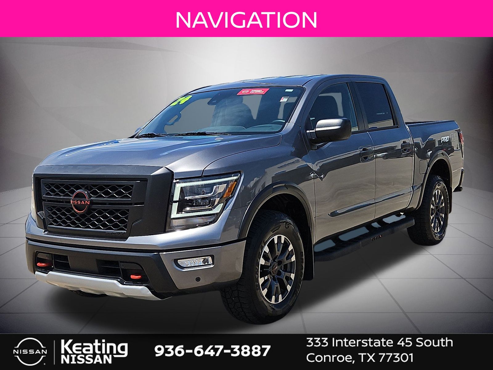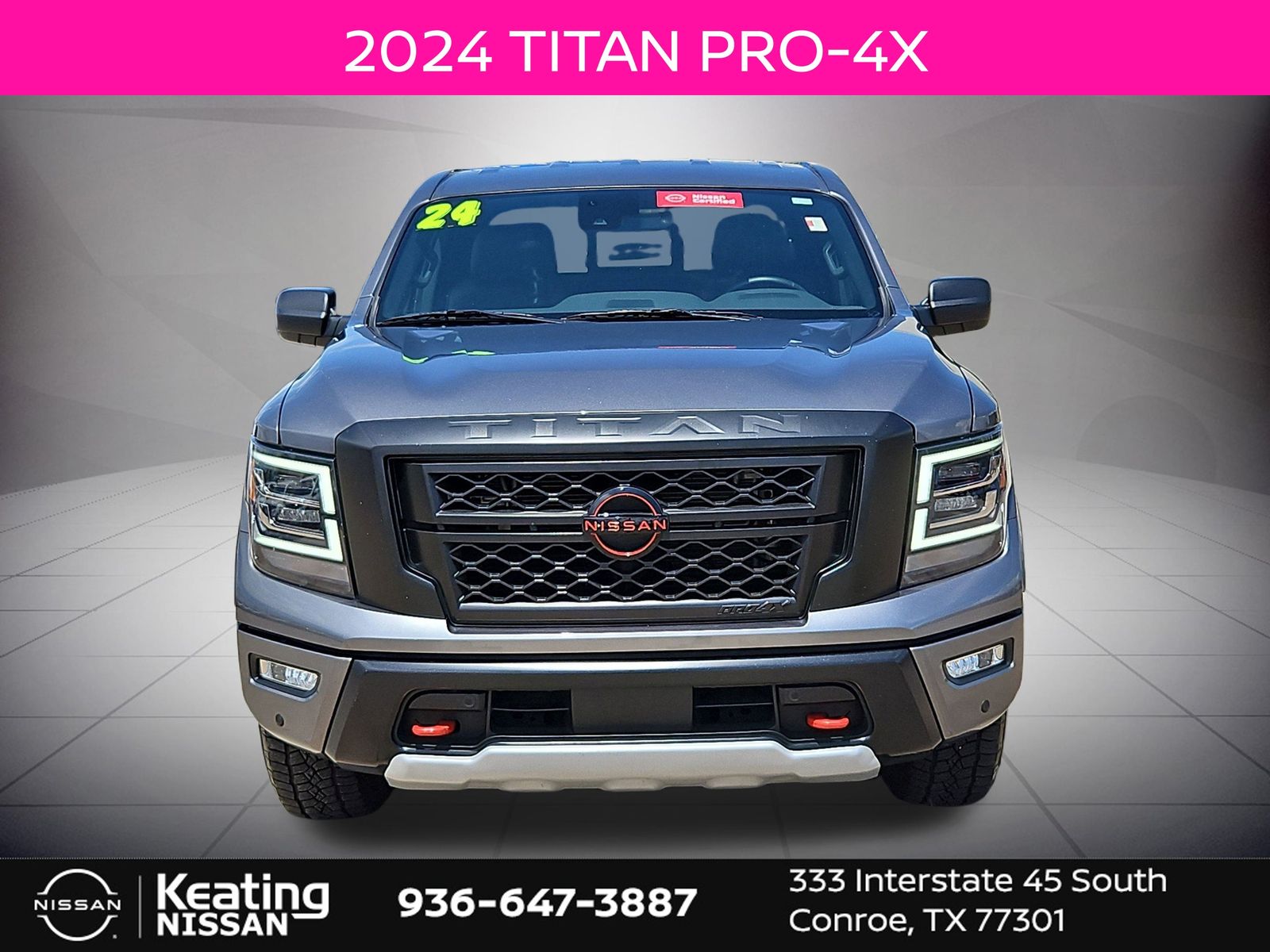 • The 2024 Nissan Titan PRO-4X in striking Gun Metallic with a premium Black interior is built for drivers who demand power, capability, and advanced technology in one rugged package. Whether conquering off-road trails or cruising the highway, the Titan PRO-4X delivers a commanding presence and unmatched durability. Entertainment Features NissanConnect with 9-inch touchscreen display Apple CarPlay integration Android Auto integration Fender premium audio system with 12 speakers Bluetooth hands-free phone system SiriusXM Radio with 3-month trial subscription Safety Features Nissan Safety Shield 360 Automatic Emergency Braking with Pedestrian Detection Blind Spot Warning Rear Cross Traffic Alert Lane Departure Warning High Beam Assist Standard Features 5.6L Endurance V8 engine with 400 horsepower 9-speed automatic transmission Bilstein off-road performance shocks Electronic locking rear differential Hill Descent Control LED headlights and daytime running lights Skid plates for underbody protection Dual-zone automatic temperature control Remote Engine Start System with Intelligent Climate Control Intelligent Around View Monitor Why Shop & Buy Your Next Vehicle at Keating Nissan of Conroe, Texas Huge selection of new and pre-owned vehicles Transparent, no-pressure buying experience Competitive financing and lease options Top trade-in values for your current vehicle Factory-trained Nissan service technicians State-of-the-art service facility Convenient location and hours Fast, easy online shopping tools Family-owned and locally operated Award-winning customer service At Keating Nissan of Conroe, we pride ourselves on exceptional customer satisfaction, reflected in our outstanding Google reviews. For example, Mark T. (June 25, 2025) wrote: "From the moment I walked in, I felt valued. The staff went above and beyond to answer my questions and made the entire buying process smooth and enjoyable. I absolutely love my new Titan!" Come experience the rugged capability and modern comfort of this 2024 Nissan Titan PRO-4X today its ready to elevate your driving adventures.