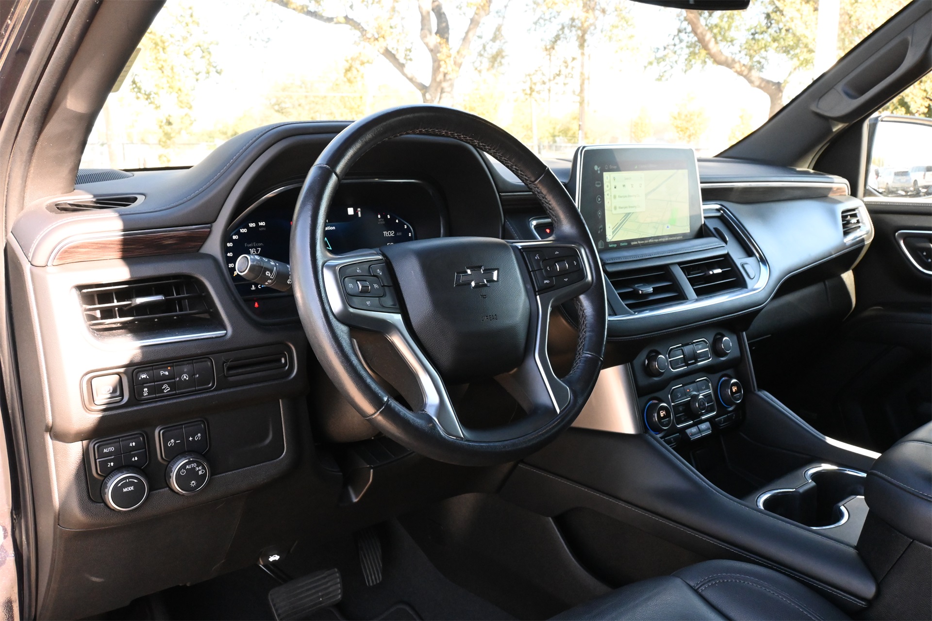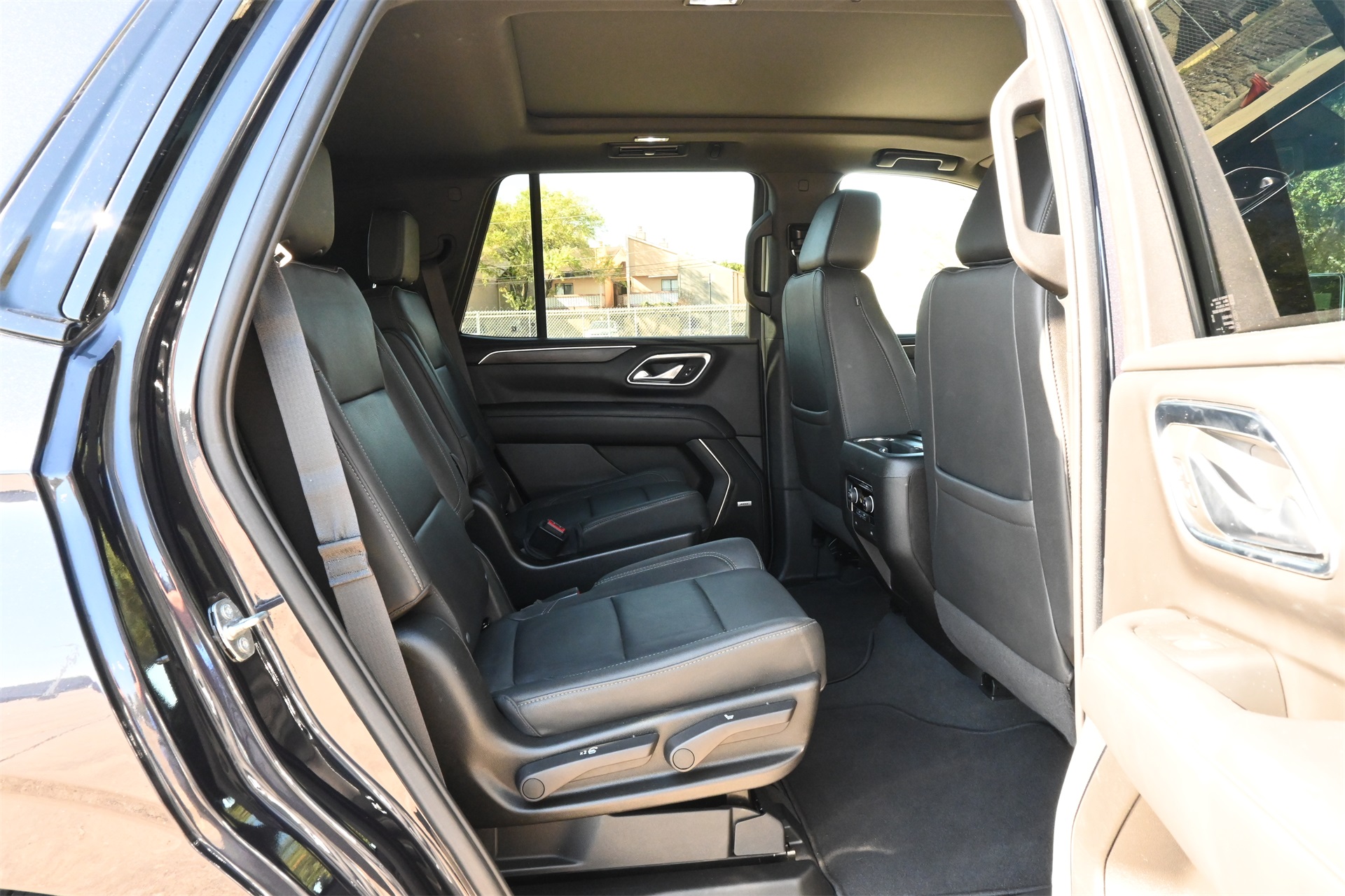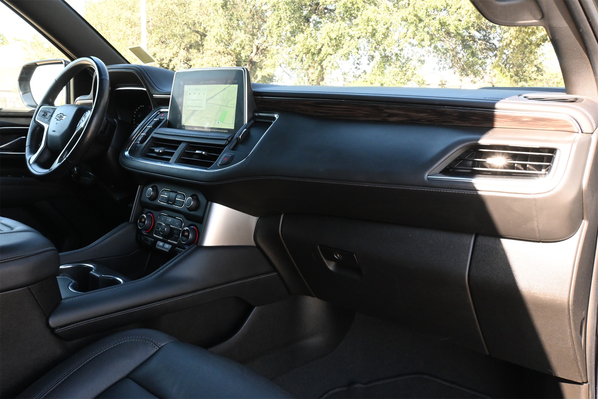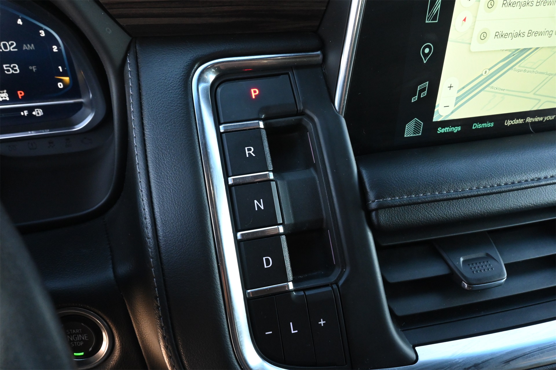 ter, Floor Console w/Storage Area, Front High-Approach Angle Fascia, Hands-Free Rear Power Programmable Liftgate, Hill Descent Control, Infotainment Display, LED Daytime Running Lamps, Memory Settings for Driver, Red Horizontal-Mounted Recovery Hooks, Remote Start, SiriusXM Radio w/360L, Universal Home Remote, Wireless Charging, and Wrapped Steering Wheel), 4WD, Black Leather, 10-Way Power Driver & Passenger Seat Adjusters, 2nd Row Manual Bucket Seats, 3.23 Rear Axle Ratio, 3rd row seats: split-bench, 4-Wheel Disc Brakes, 9 Speakers, ABS brakes, Air Conditioning, Alloy wheels, AM/FM radio: SiriusXM with 360L, Apple CarPlay/Android Auto, Auto High-beam Headlights, Auto-dimming Rear-View mirror, Automatic temperature control, Brake assist, Bumpers: body-color, Compass, Delay-off headlights, Driver door bin, Driver vanity mirror, Dual front impact airbags, Dual front side impact airbags, Dual-Pane Power Panoramic Sunroof, Electronic Stability Control, Emergency communication system: OnStar and Chevrolet connected services capable, Four wheel independent suspension, Front anti-roll bar, Front Bucket Seats, Front Center Armrest, Front dual zone A/C, Front High-Back Reclining Bucket Seats, Front reading lights, Fully automatic headlights, Garage door transmitter, Heated door mirrors, Heated Driver & Front Passenger Seats, Heated front seats, Illuminated entry, Leather-Appointed Seat Trim, Low tire pressure warning, Memory seat, Navigation System, Occupant sensing airbag, Outside temperature display, Overhead airbag, Overhead console, Panic alarm, Passenger door bin, Passenger vanity mirror, Power door mirrors, Power driver seat, Power Liftgate, Power passenger seat, Power steering, Power windows, Premium audio system: Chevrolet Infotainment 3 Premium, Premium Smooth Ride Suspension, Radio: Chevrolet Infotainment 3 Premium System, Rain sensing wipers, Rear air conditioning, Rear anti-roll bar, Rear reading lights, Rear seat center armrest, Rear window defroster, Rear window wiper, Remote keyless entry, Roof rack: rails only, Security system, Speed control, Speed-sensing steering, Split folding rear seat, Spoiler, Steering wheel mounted audio controls, Tachometer, Telescoping steering wheel, Tilt steering wheel, Traction control, Trip computer, Variably intermittent wipers, Voltmeter, and Wheels: 20" x 9" Machined Aluminum. Dark Ash Metallic 4WD 10-Speed Automatic with Overdrive EcoTec3 5.3L V8 Clean CARFAX!, Non-Smoker, Local Trade, Bluetooth, Apple Carplay / Android Auto, Heated Seats, Cooled Seats, 4WD, Black Leather.