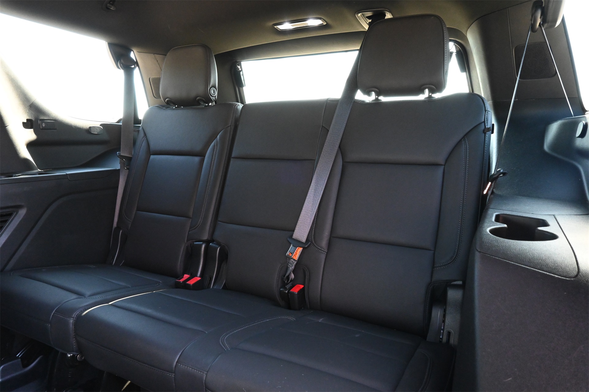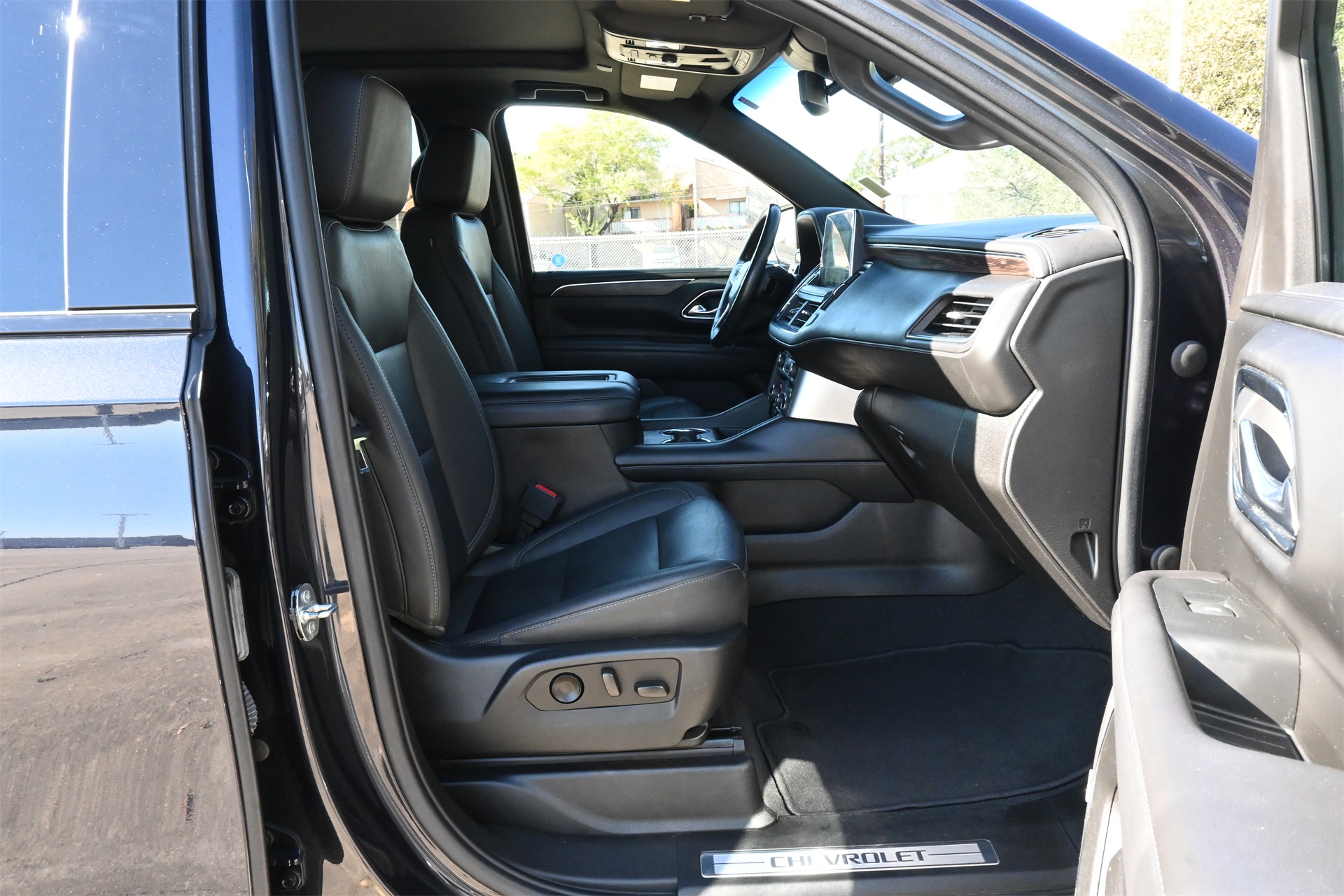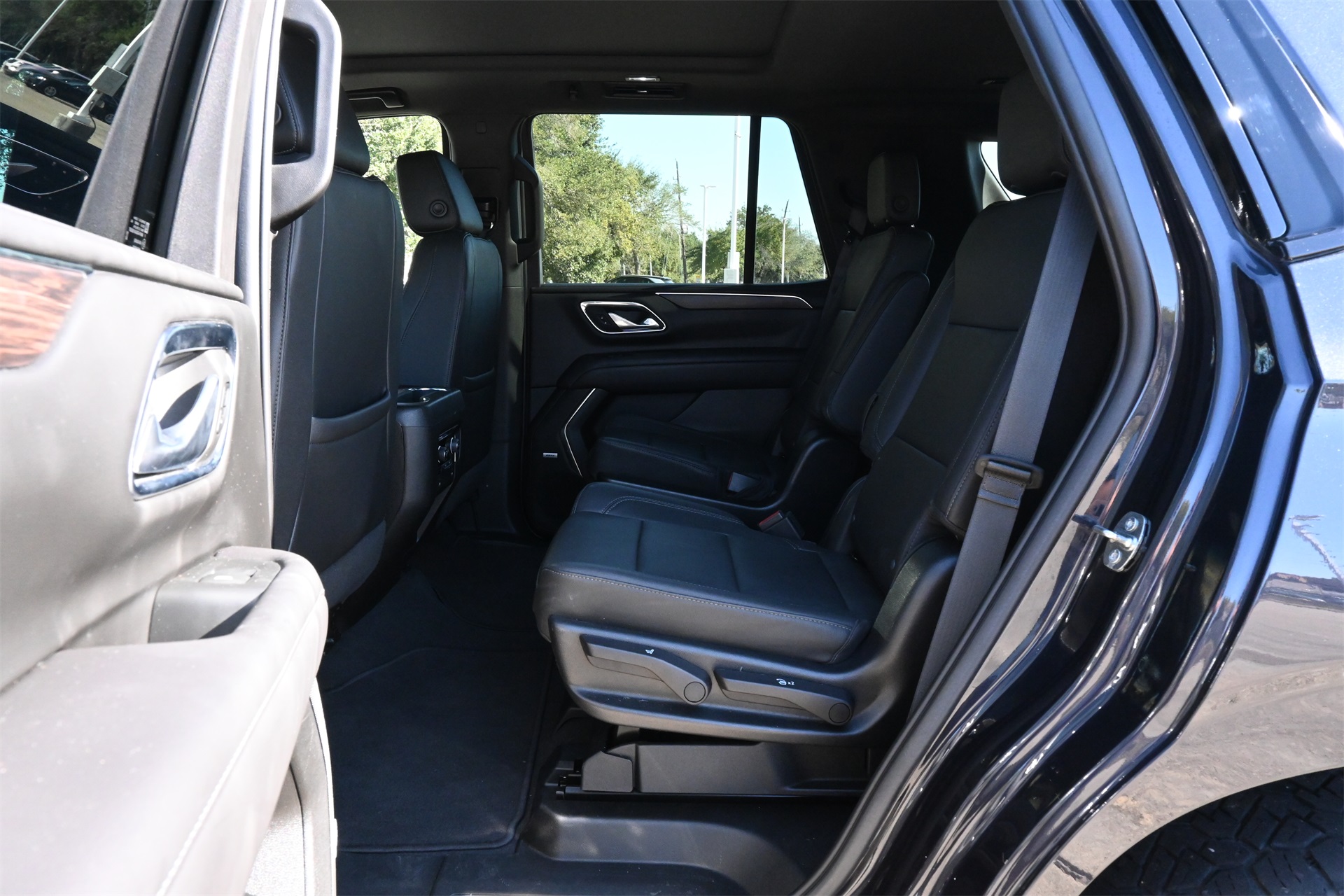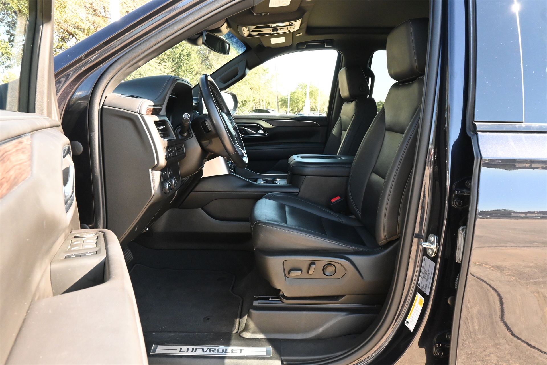 ter, Floor Console w/Storage Area, Front High-Approach Angle Fascia, Hands-Free Rear Power Programmable Liftgate, Hill Descent Control, Infotainment Display, LED Daytime Running Lamps, Memory Settings for Driver, Red Horizontal-Mounted Recovery Hooks, Remote Start, SiriusXM Radio w/360L, Universal Home Remote, Wireless Charging, and Wrapped Steering Wheel), 4WD, Black Leather, 10-Way Power Driver & Passenger Seat Adjusters, 2nd Row Manual Bucket Seats, 3.23 Rear Axle Ratio, 3rd row seats: split-bench, 4-Wheel Disc Brakes, 9 Speakers, ABS brakes, Air Conditioning, Alloy wheels, AM/FM radio: SiriusXM with 360L, Apple CarPlay/Android Auto, Auto High-beam Headlights, Auto-dimming Rear-View mirror, Automatic temperature control, Brake assist, Bumpers: body-color, Compass, Delay-off headlights, Driver door bin, Driver vanity mirror, Dual front impact airbags, Dual front side impact airbags, Dual-Pane Power Panoramic Sunroof, Electronic Stability Control, Emergency communication system: OnStar and Chevrolet connected services capable, Four wheel independent suspension, Front anti-roll bar, Front Bucket Seats, Front Center Armrest, Front dual zone A/C, Front High-Back Reclining Bucket Seats, Front reading lights, Fully automatic headlights, Garage door transmitter, Heated door mirrors, Heated Driver & Front Passenger Seats, Heated front seats, Illuminated entry, Leather-Appointed Seat Trim, Low tire pressure warning, Memory seat, Navigation System, Occupant sensing airbag, Outside temperature display, Overhead airbag, Overhead console, Panic alarm, Passenger door bin, Passenger vanity mirror, Power door mirrors, Power driver seat, Power Liftgate, Power passenger seat, Power steering, Power windows, Premium audio system: Chevrolet Infotainment 3 Premium, Premium Smooth Ride Suspension, Radio: Chevrolet Infotainment 3 Premium System, Rain sensing wipers, Rear air conditioning, Rear anti-roll bar, Rear reading lights, Rear seat center armrest, Rear window defroster, Rear window wiper, Remote keyless entry, Roof rack: rails only, Security system, Speed control, Speed-sensing steering, Split folding rear seat, Spoiler, Steering wheel mounted audio controls, Tachometer, Telescoping steering wheel, Tilt steering wheel, Traction control, Trip computer, Variably intermittent wipers, Voltmeter, and Wheels: 20" x 9" Machined Aluminum. Dark Ash Metallic 4WD 10-Speed Automatic with Overdrive EcoTec3 5.3L V8 Clean CARFAX!, Non-Smoker, Local Trade, Bluetooth, Apple Carplay / Android Auto, Heated Seats, Cooled Seats, 4WD, Black Leather.