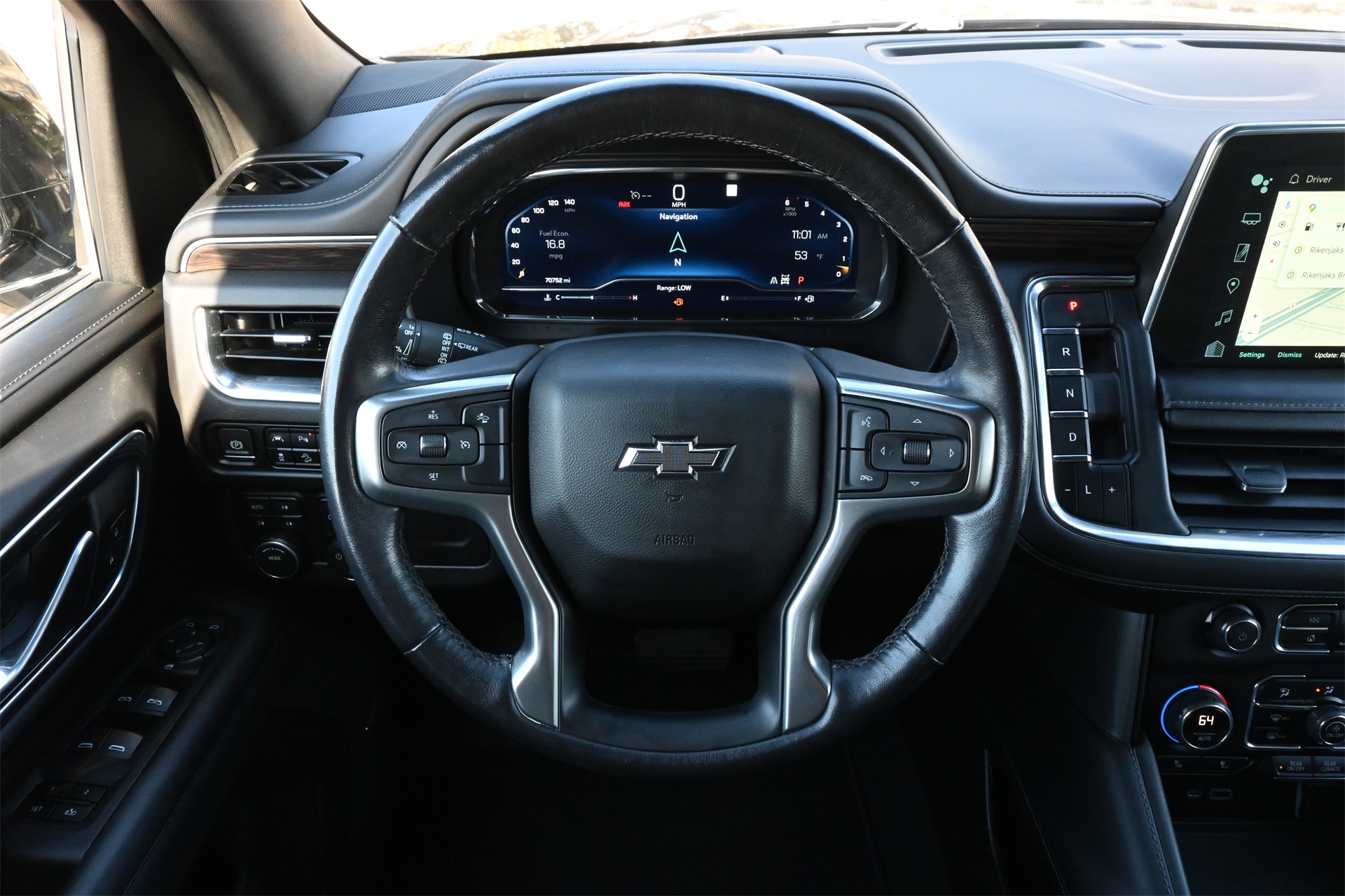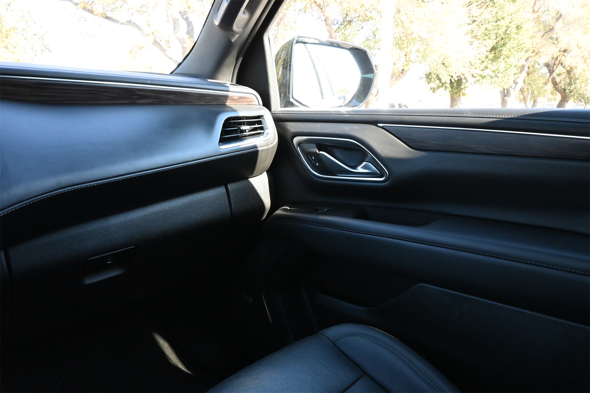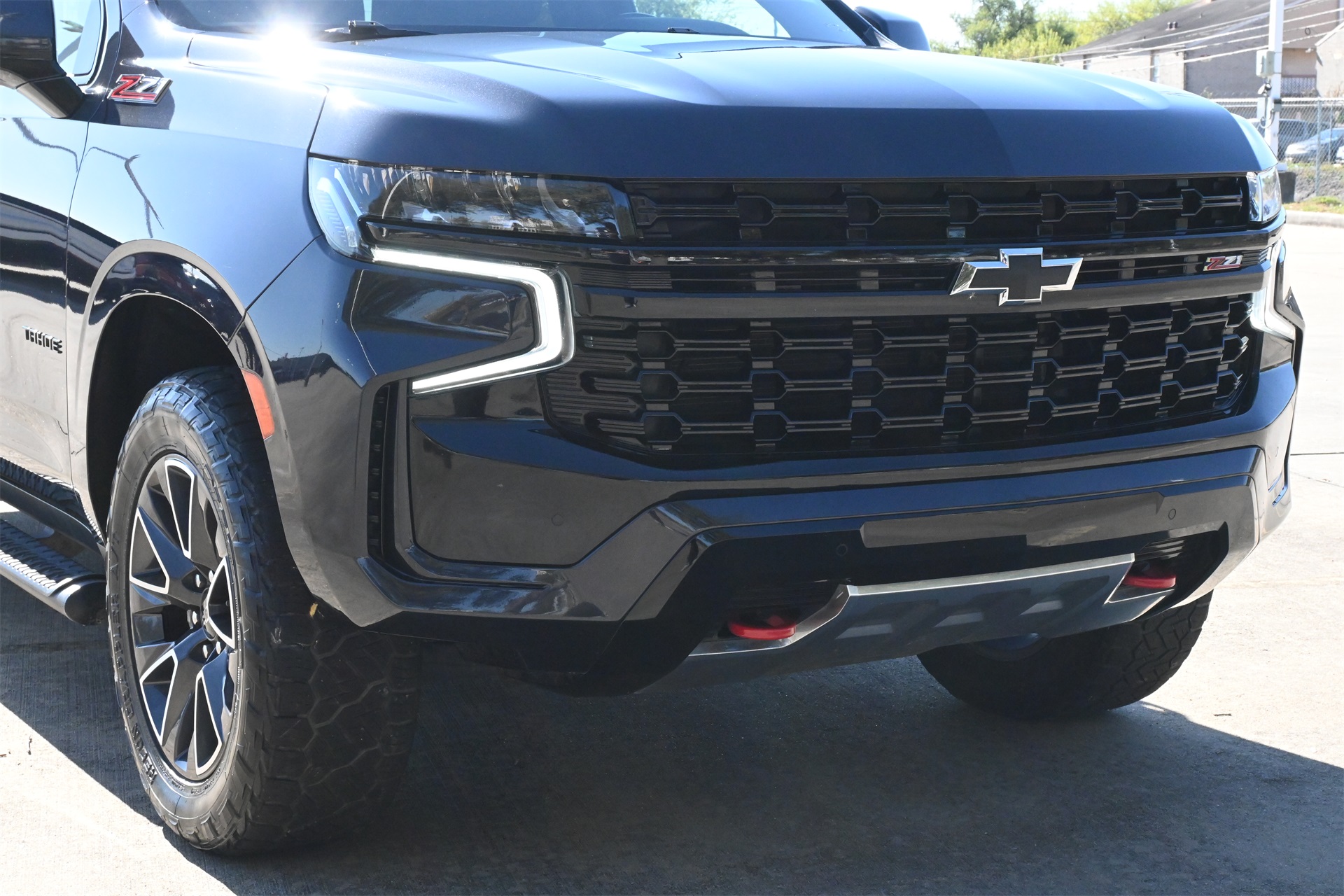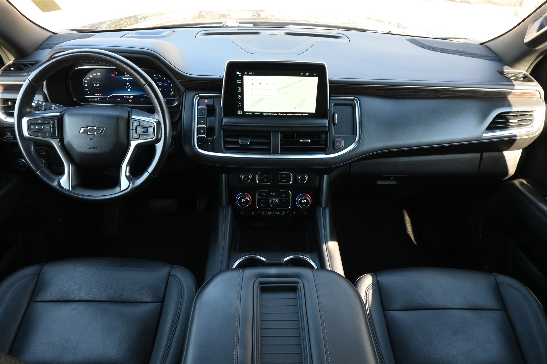 ter, Floor Console w/Storage Area, Front High-Approach Angle Fascia, Hands-Free Rear Power Programmable Liftgate, Hill Descent Control, Infotainment Display, LED Daytime Running Lamps, Memory Settings for Driver, Red Horizontal-Mounted Recovery Hooks, Remote Start, SiriusXM Radio w/360L, Universal Home Remote, Wireless Charging, and Wrapped Steering Wheel), 4WD, Black Leather, 10-Way Power Driver & Passenger Seat Adjusters, 2nd Row Manual Bucket Seats, 3.23 Rear Axle Ratio, 3rd row seats: split-bench, 4-Wheel Disc Brakes, 9 Speakers, ABS brakes, Air Conditioning, Alloy wheels, AM/FM radio: SiriusXM with 360L, Apple CarPlay/Android Auto, Auto High-beam Headlights, Auto-dimming Rear-View mirror, Automatic temperature control, Brake assist, Bumpers: body-color, Compass, Delay-off headlights, Driver door bin, Driver vanity mirror, Dual front impact airbags, Dual front side impact airbags, Dual-Pane Power Panoramic Sunroof, Electronic Stability Control, Emergency communication system: OnStar and Chevrolet connected services capable, Four wheel independent suspension, Front anti-roll bar, Front Bucket Seats, Front Center Armrest, Front dual zone A/C, Front High-Back Reclining Bucket Seats, Front reading lights, Fully automatic headlights, Garage door transmitter, Heated door mirrors, Heated Driver & Front Passenger Seats, Heated front seats, Illuminated entry, Leather-Appointed Seat Trim, Low tire pressure warning, Memory seat, Navigation System, Occupant sensing airbag, Outside temperature display, Overhead airbag, Overhead console, Panic alarm, Passenger door bin, Passenger vanity mirror, Power door mirrors, Power driver seat, Power Liftgate, Power passenger seat, Power steering, Power windows, Premium audio system: Chevrolet Infotainment 3 Premium, Premium Smooth Ride Suspension, Radio: Chevrolet Infotainment 3 Premium System, Rain sensing wipers, Rear air conditioning, Rear anti-roll bar, Rear reading lights, Rear seat center armrest, Rear window defroster, Rear window wiper, Remote keyless entry, Roof rack: rails only, Security system, Speed control, Speed-sensing steering, Split folding rear seat, Spoiler, Steering wheel mounted audio controls, Tachometer, Telescoping steering wheel, Tilt steering wheel, Traction control, Trip computer, Variably intermittent wipers, Voltmeter, and Wheels: 20" x 9" Machined Aluminum. Dark Ash Metallic 4WD 10-Speed Automatic with Overdrive EcoTec3 5.3L V8 Clean CARFAX!, Non-Smoker, Local Trade, Bluetooth, Apple Carplay / Android Auto, Heated Seats, Cooled Seats, 4WD, Black Leather.