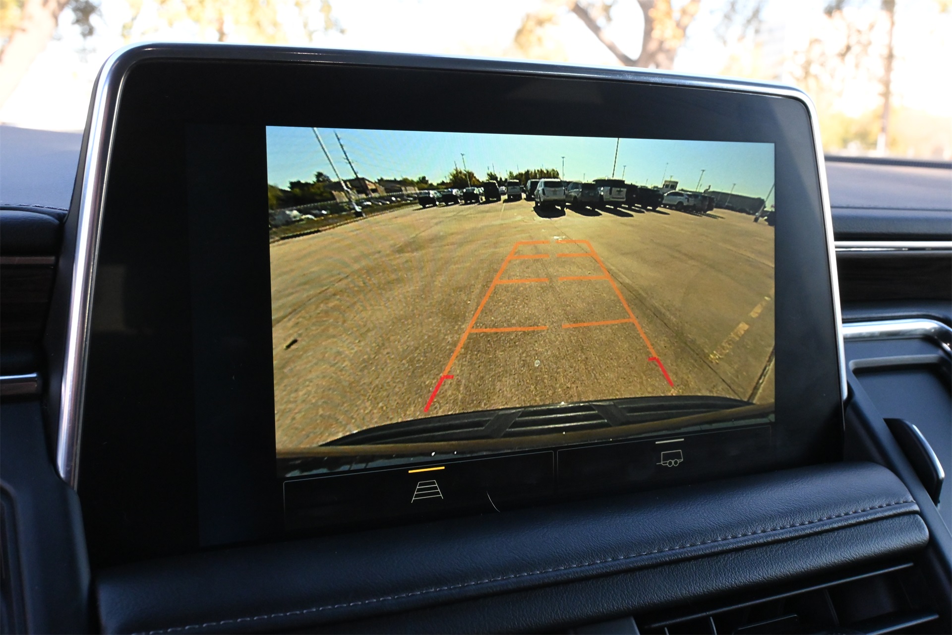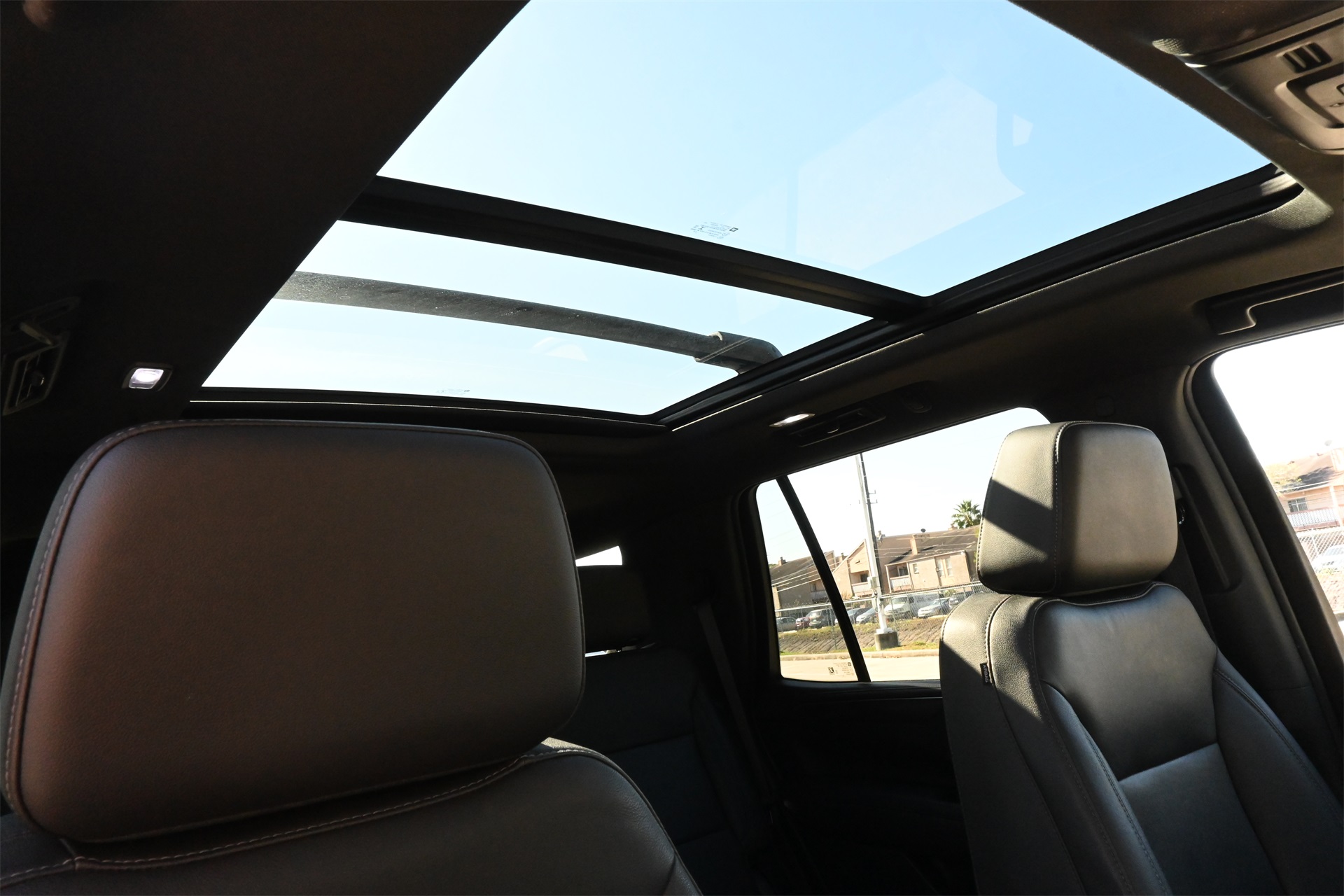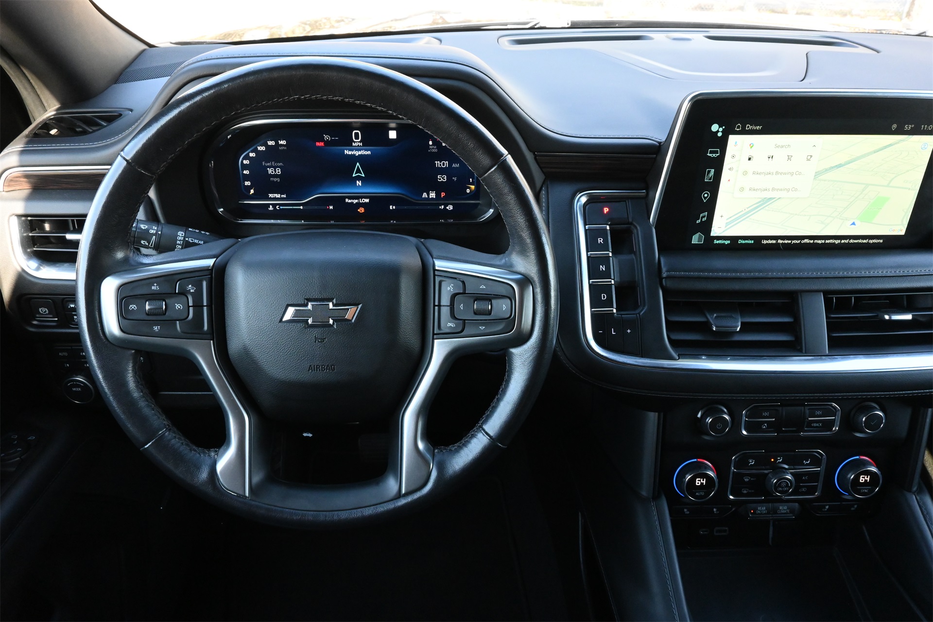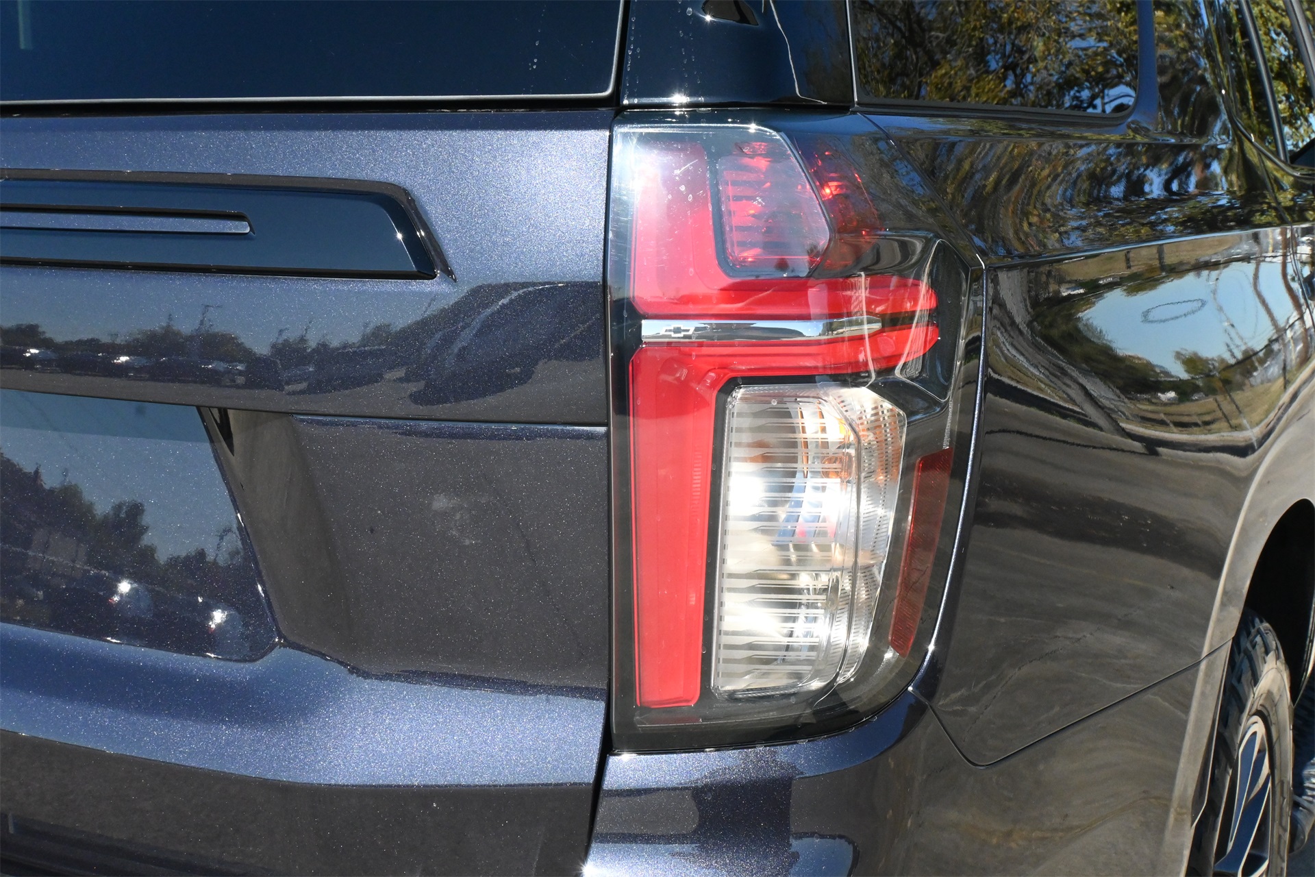 ter, Floor Console w/Storage Area, Front High-Approach Angle Fascia, Hands-Free Rear Power Programmable Liftgate, Hill Descent Control, Infotainment Display, LED Daytime Running Lamps, Memory Settings for Driver, Red Horizontal-Mounted Recovery Hooks, Remote Start, SiriusXM Radio w/360L, Universal Home Remote, Wireless Charging, and Wrapped Steering Wheel), 4WD, Black Leather, 10-Way Power Driver & Passenger Seat Adjusters, 2nd Row Manual Bucket Seats, 3.23 Rear Axle Ratio, 3rd row seats: split-bench, 4-Wheel Disc Brakes, 9 Speakers, ABS brakes, Air Conditioning, Alloy wheels, AM/FM radio: SiriusXM with 360L, Apple CarPlay/Android Auto, Auto High-beam Headlights, Auto-dimming Rear-View mirror, Automatic temperature control, Brake assist, Bumpers: body-color, Compass, Delay-off headlights, Driver door bin, Driver vanity mirror, Dual front impact airbags, Dual front side impact airbags, Dual-Pane Power Panoramic Sunroof, Electronic Stability Control, Emergency communication system: OnStar and Chevrolet connected services capable, Four wheel independent suspension, Front anti-roll bar, Front Bucket Seats, Front Center Armrest, Front dual zone A/C, Front High-Back Reclining Bucket Seats, Front reading lights, Fully automatic headlights, Garage door transmitter, Heated door mirrors, Heated Driver & Front Passenger Seats, Heated front seats, Illuminated entry, Leather-Appointed Seat Trim, Low tire pressure warning, Memory seat, Navigation System, Occupant sensing airbag, Outside temperature display, Overhead airbag, Overhead console, Panic alarm, Passenger door bin, Passenger vanity mirror, Power door mirrors, Power driver seat, Power Liftgate, Power passenger seat, Power steering, Power windows, Premium audio system: Chevrolet Infotainment 3 Premium, Premium Smooth Ride Suspension, Radio: Chevrolet Infotainment 3 Premium System, Rain sensing wipers, Rear air conditioning, Rear anti-roll bar, Rear reading lights, Rear seat center armrest, Rear window defroster, Rear window wiper, Remote keyless entry, Roof rack: rails only, Security system, Speed control, Speed-sensing steering, Split folding rear seat, Spoiler, Steering wheel mounted audio controls, Tachometer, Telescoping steering wheel, Tilt steering wheel, Traction control, Trip computer, Variably intermittent wipers, Voltmeter, and Wheels: 20" x 9" Machined Aluminum. Dark Ash Metallic 4WD 10-Speed Automatic with Overdrive EcoTec3 5.3L V8 Clean CARFAX!, Non-Smoker, Local Trade, Bluetooth, Apple Carplay / Android Auto, Heated Seats, Cooled Seats, 4WD, Black Leather.